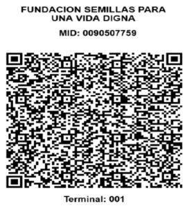 Donaciones Si estás en Colombiapuedes hacer tu donación a:BBVA ColombiaCuenta Ahorros#099-50012-96Fundación Semillas para una vida dignaNIT 901234030-4 O escanea el siguiente código QR con la app de tu banco: